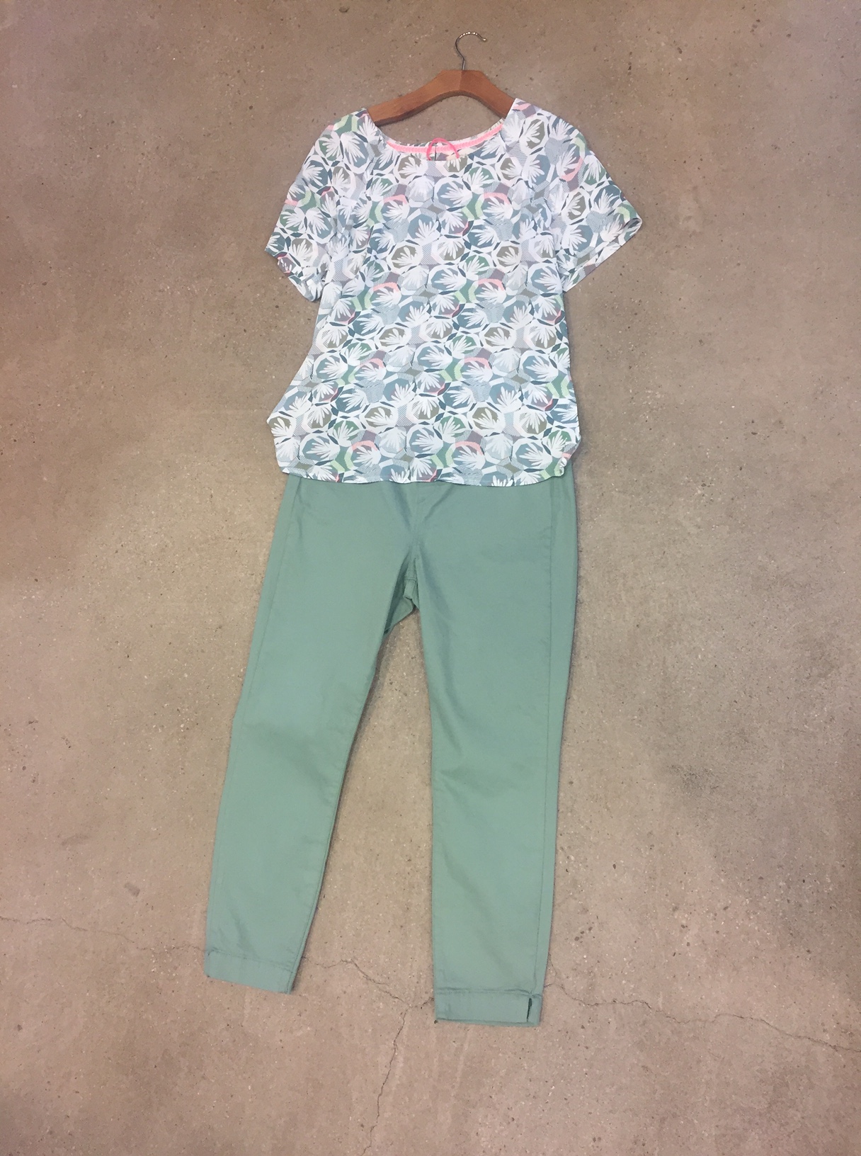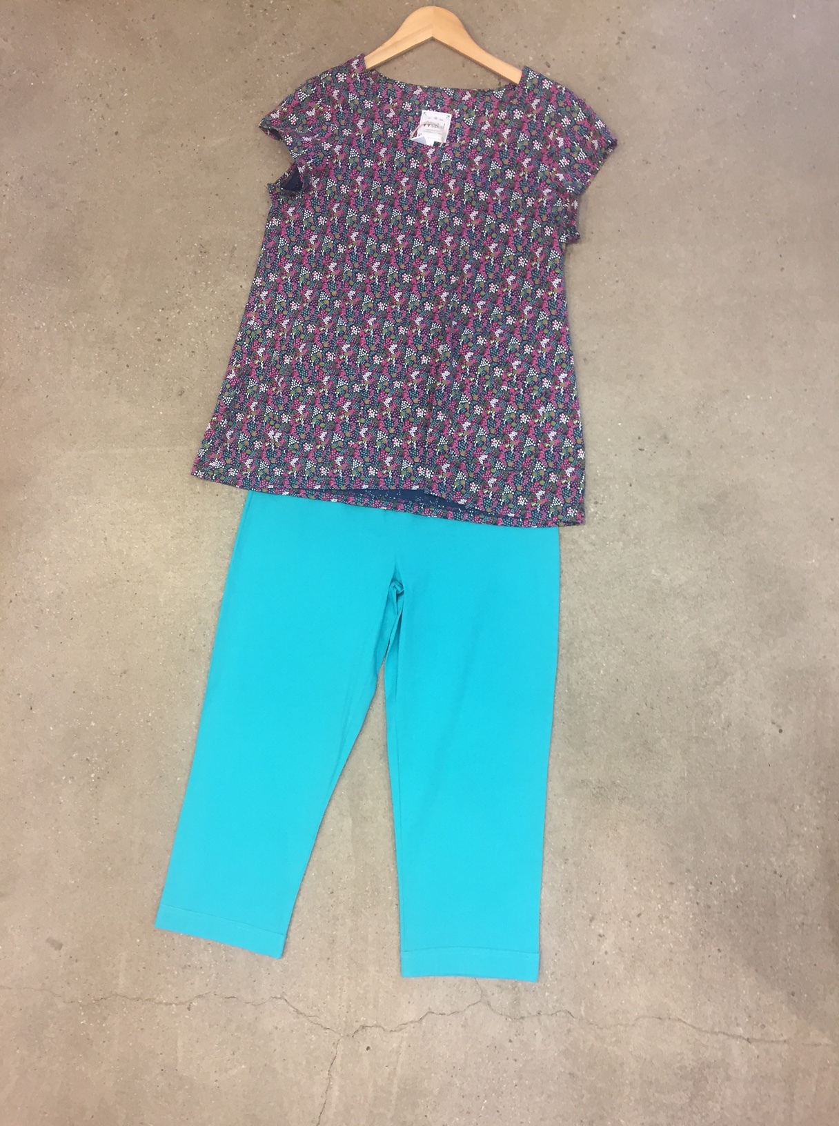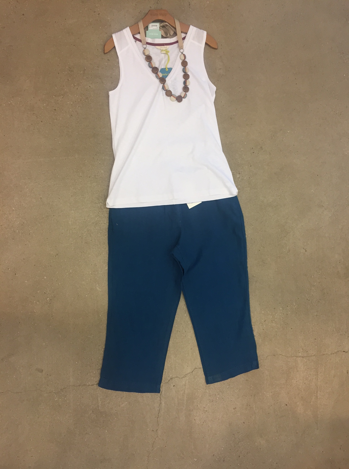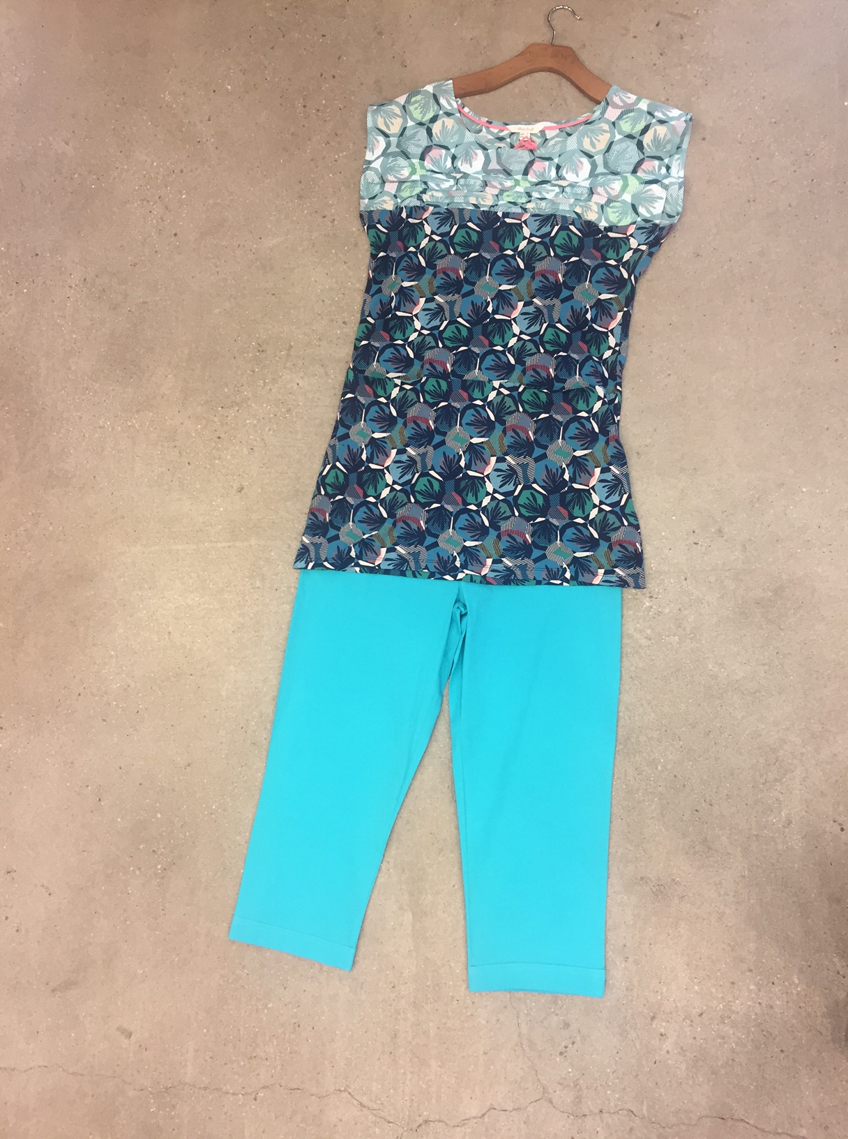 The teal of the crops also pulls out the teal in the 30`s Ditsy Print Willow Tee from mistral to make give this classic top a modern edge. With its loose fit and 100% cotton jersey its perfect for warm summers days.